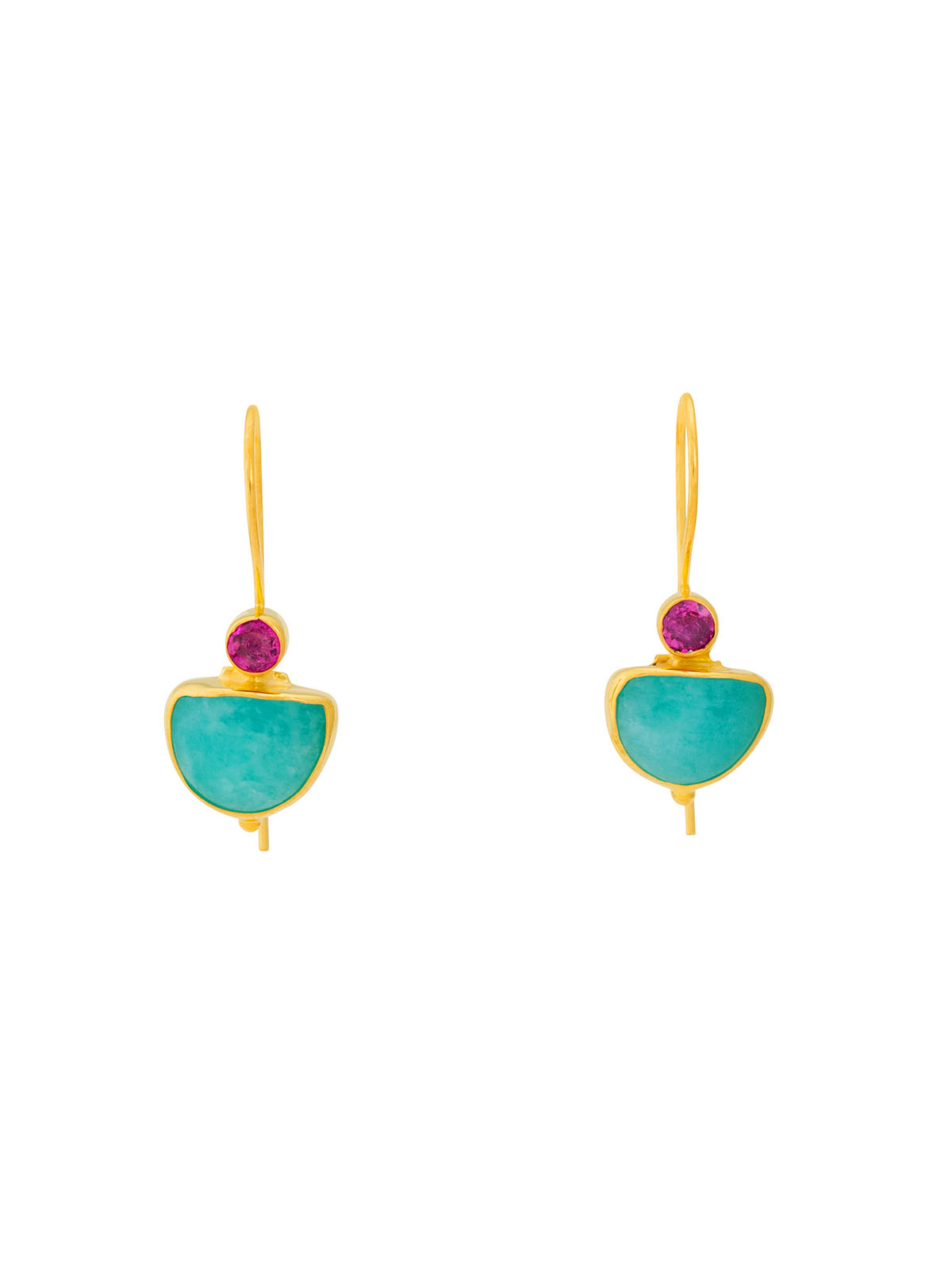 Mix and match to change your look, with this natural amazonite hook earrings are a must-have. Features natural amazonite with small pink tourmalines gemstones in the bezel set. The amazonite is the birthstone for March, represents ‘balance’. Made from 18k solid yellow gold with a polished finish. Wear this pair of earrings for everyday fashion accessories.