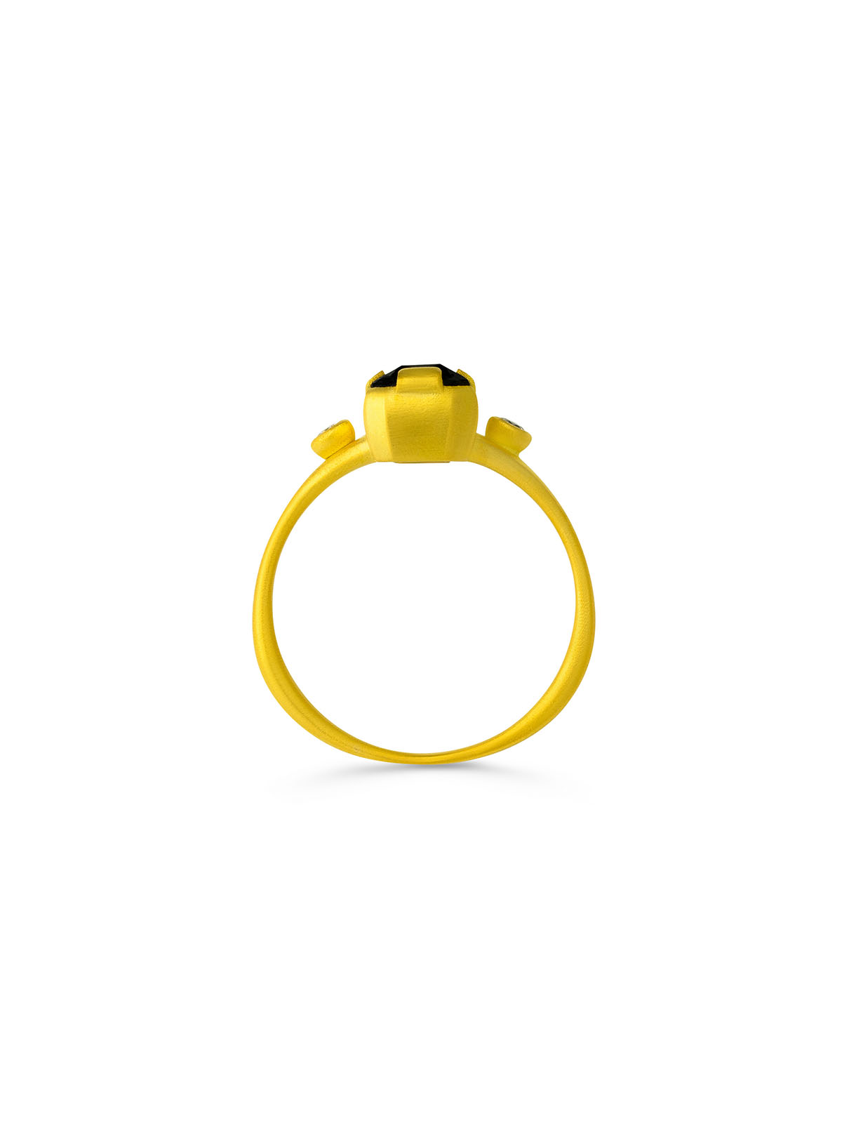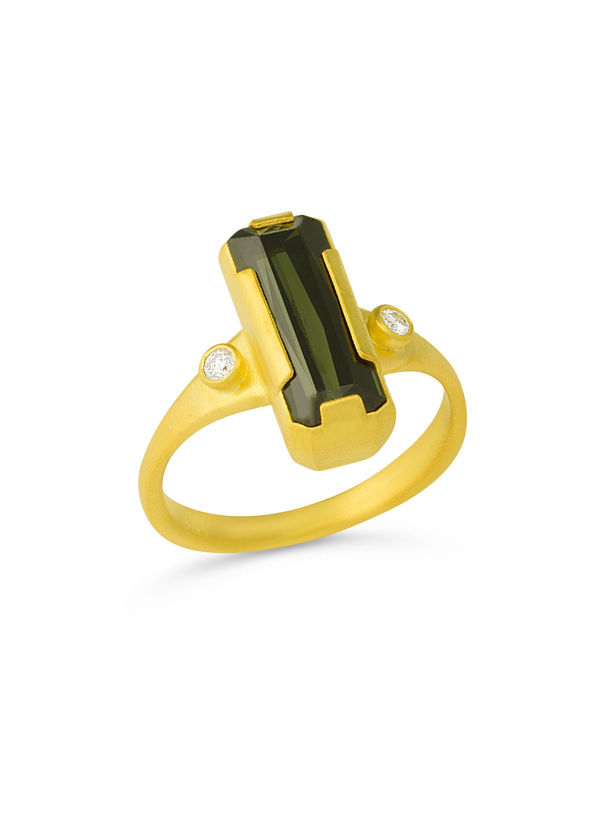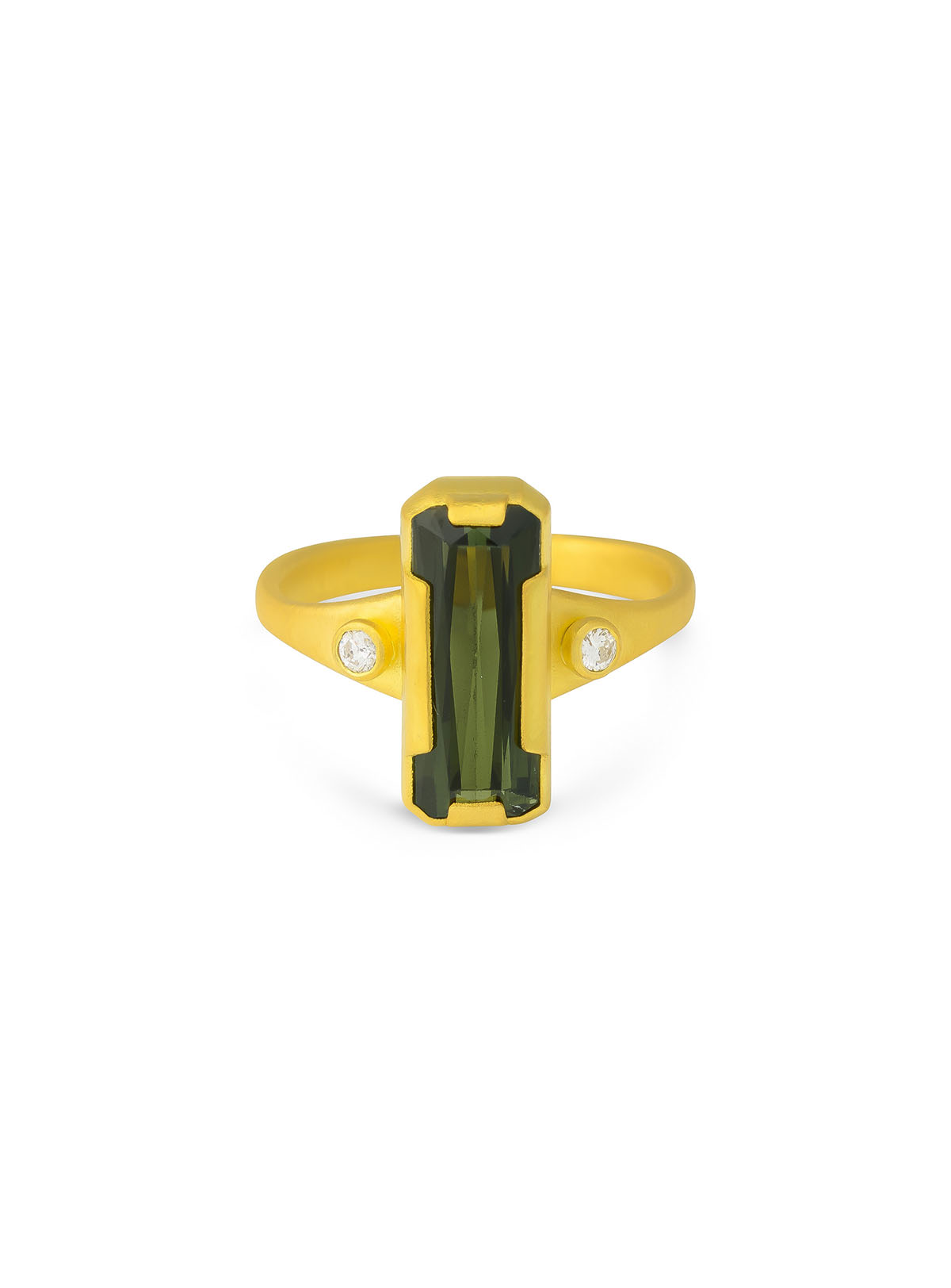 Add a scent of romance to your look by adorning your fingers with this gold ring. Featuring a rectangle shaped green tourmaline gemstone in a bezel setting with natural round cut diamonds on the sides for enhanced sparkling. Made from 18k solid yellow gold and matt finished. This ring is an everyday must, and definitely your affordable luxury choice.