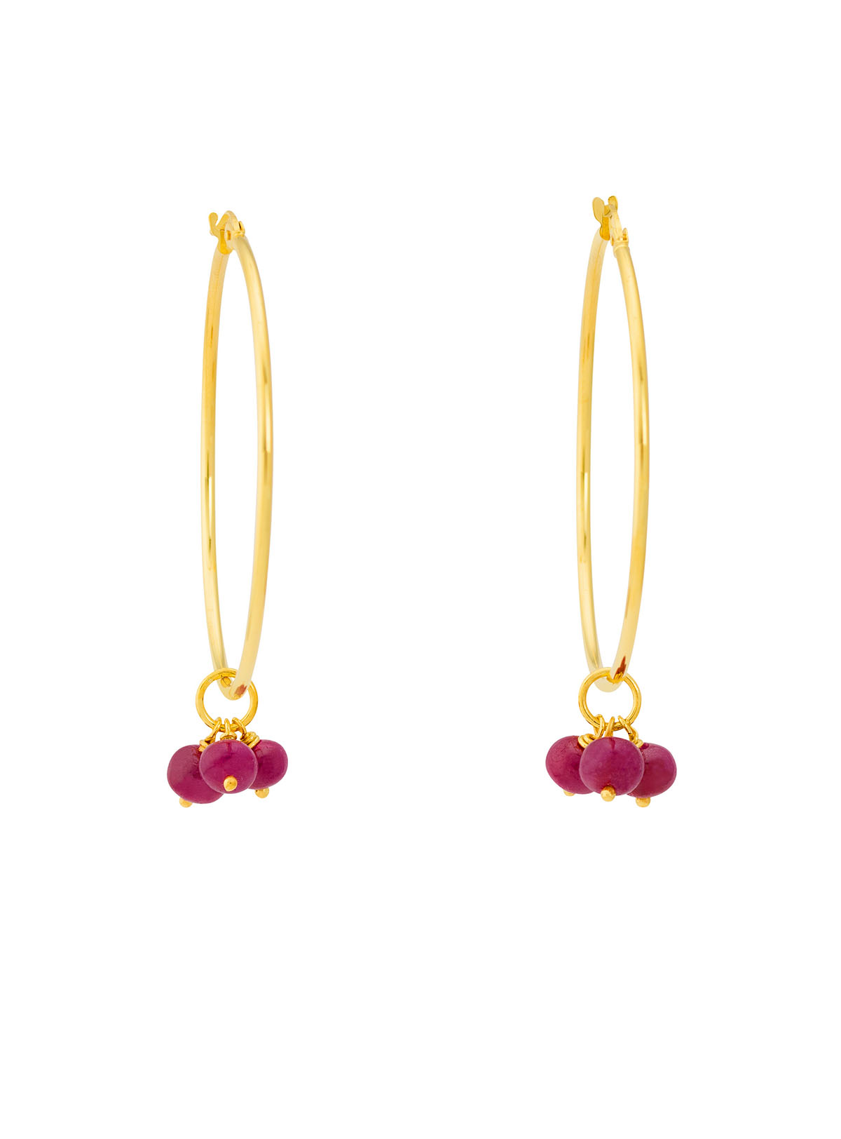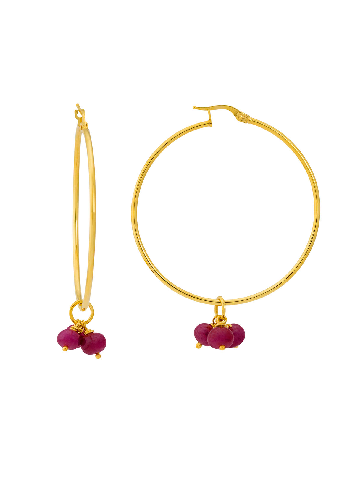 Complete any ensemble with these red rubies yellow gold hoop earrings. Features red cabochon ruby beads beneath yellow gold hoops. Made from 14k solid yellow gold with a polished finish. It comes with hinged hoop closure. These yellow gold hoops add fun and daring touch to your outfit.