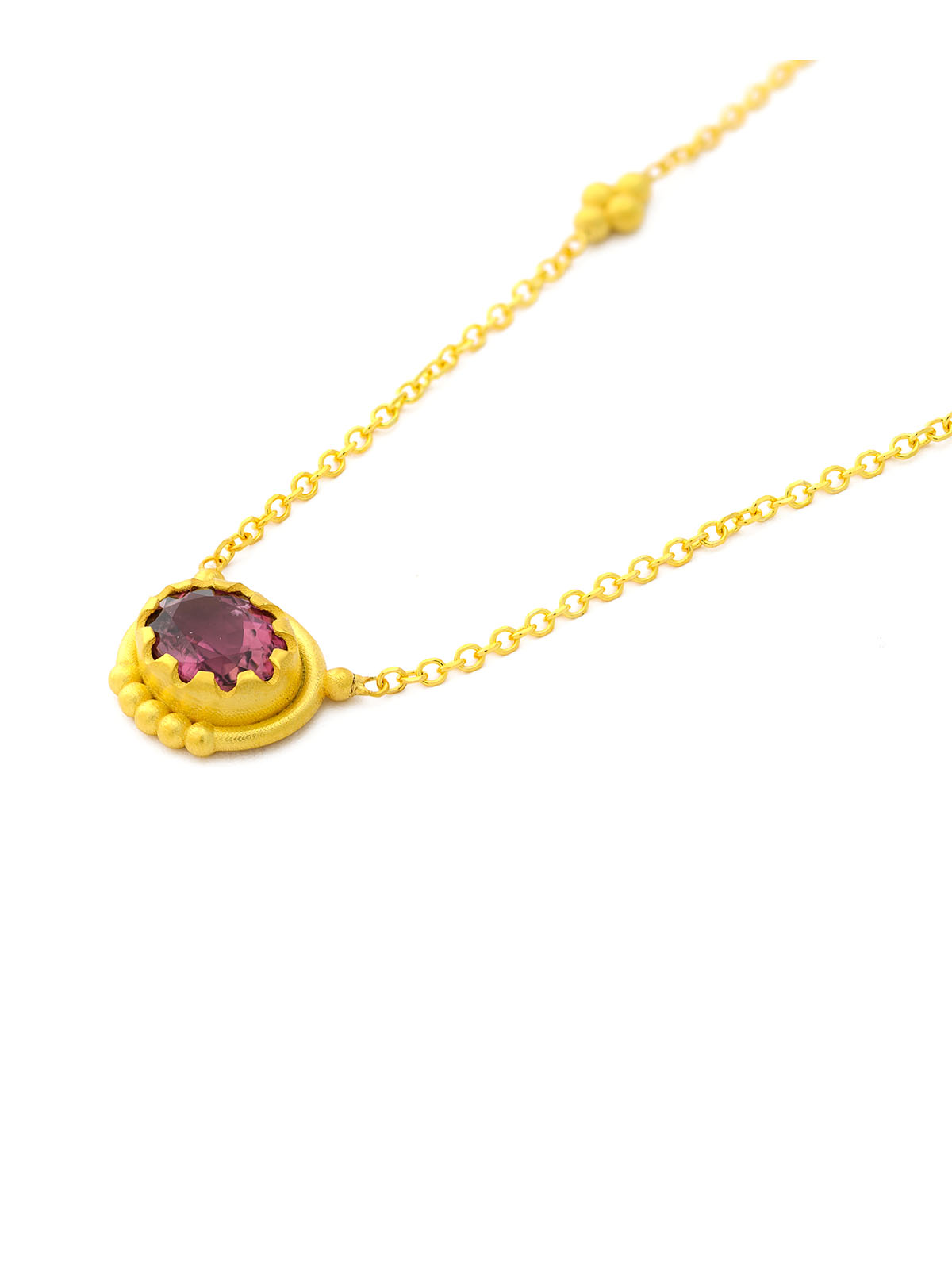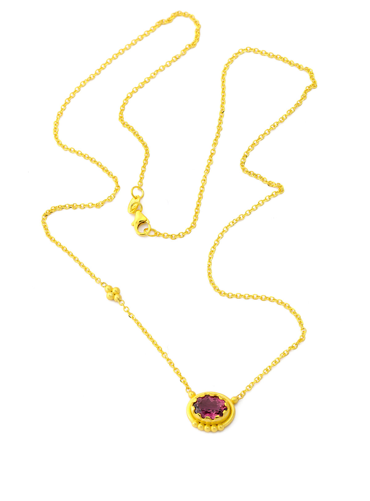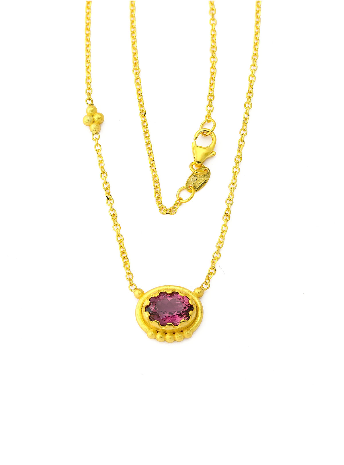 Add some subtle yet beautiful color and sparkle to your look with this stunning necklace. Made from 18k solid yellow gold and matt finished creates glamorous reflections and adds a deluxe look to this necklace. Feature a natural pink tourmaline in an illusion setting. Comes with lobster claw closure for safety. Perfect for you to wear every day, you can also add some elegance as it gives you the stunning look.